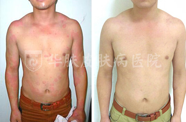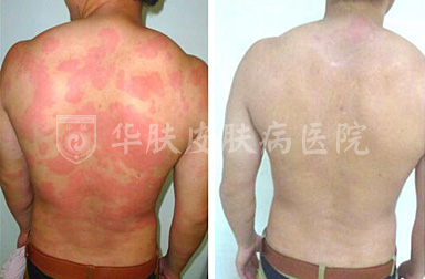 左先生后背荨麻疹治疗前后(大腿及其他部位病灶治疗效果因隐私问题未拍)