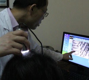 南京华肤医院利用300倍率的尖端毛囊检测设备,高倍镜5H检测,电脑-毛发/肤质检测,可以准确检测患者的毛囊细胞。